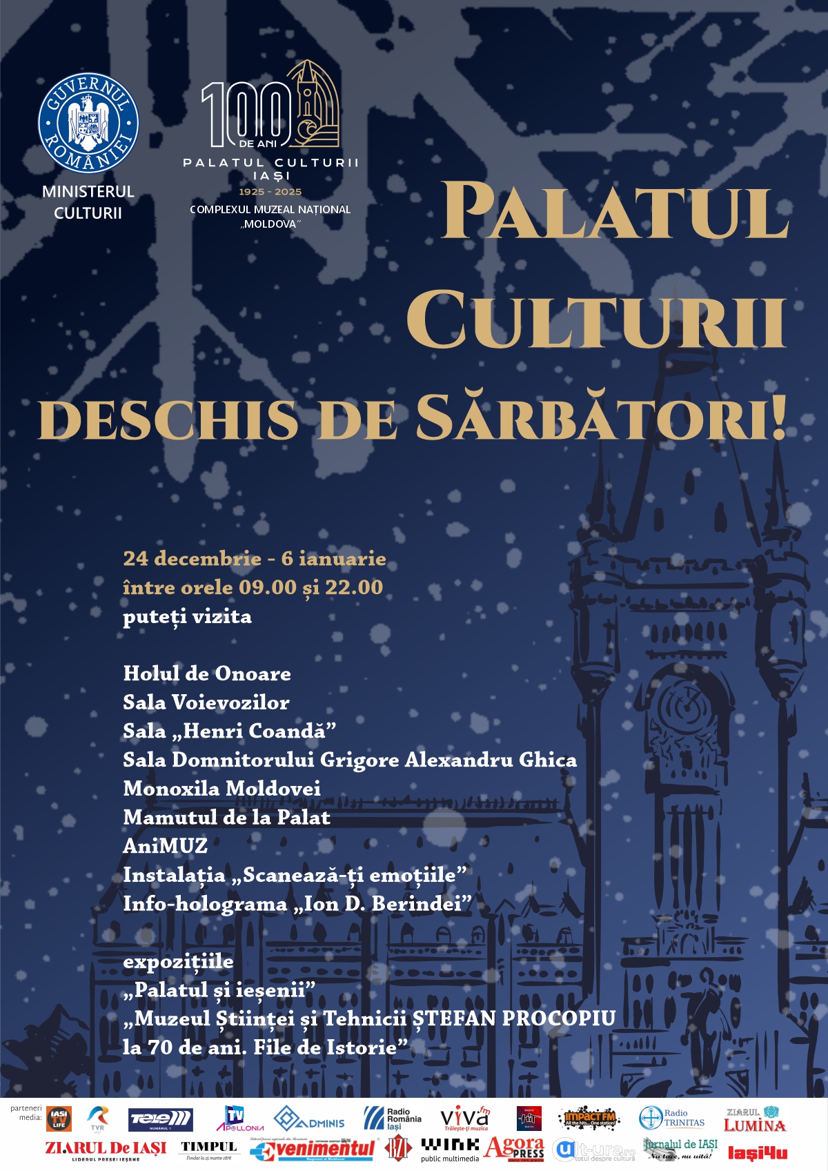 În perioada 24 decembrie 2025 – 7 ianuarie 2026, sălile reprezentative din Palatul Culturii – Holul de Onoare, Sala Voievozilor, Sala „Henri Coandă”, precum și expozițiile temporare de pe holul de la parter – sunt deschise spre vizitare în fiecare zi, între orele 9.00 și 22.00, cu posibilitatea de a achiziționa bilete online sau la automatul de bilete de la intrare.